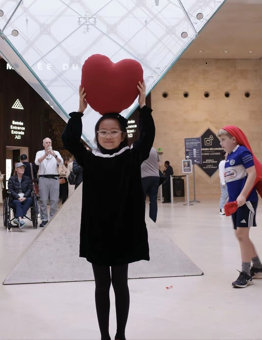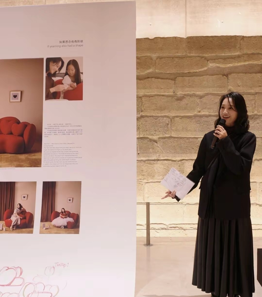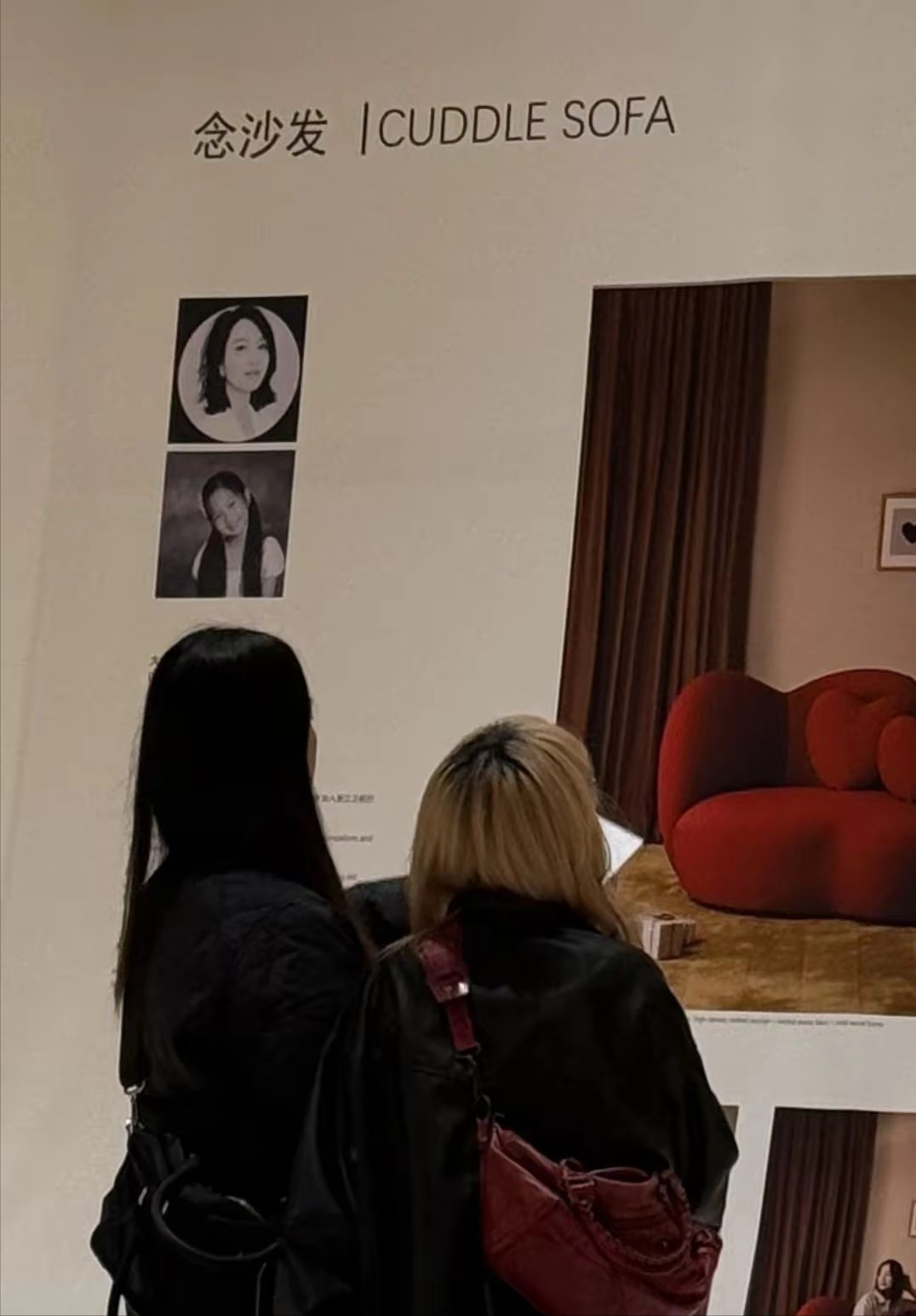 这次念念不光作品露脸,自己也罕见亮了正脸,穿黑色小裙子站在作品旁,用流利的英文给外国观众做导览,一点不怯场,法国媒体都转发夸她“设计柔软又有力量”。